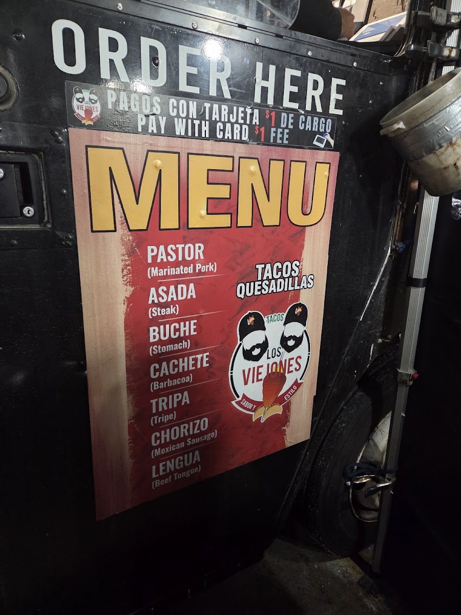 The menu at Tacos Los Viejones offers a straightforward, approachable selection of traditional Mexican tacos and simple accompaniments that invite casual, satisfying meals. Here, the focus is on flavorful, authentic bites like Tacos De Barbacoa, Carne Asada, and the distinctive Tacos Al Pastor, alongside unique options such as Tacos De Tongue and Tripas Muy Quemadas.